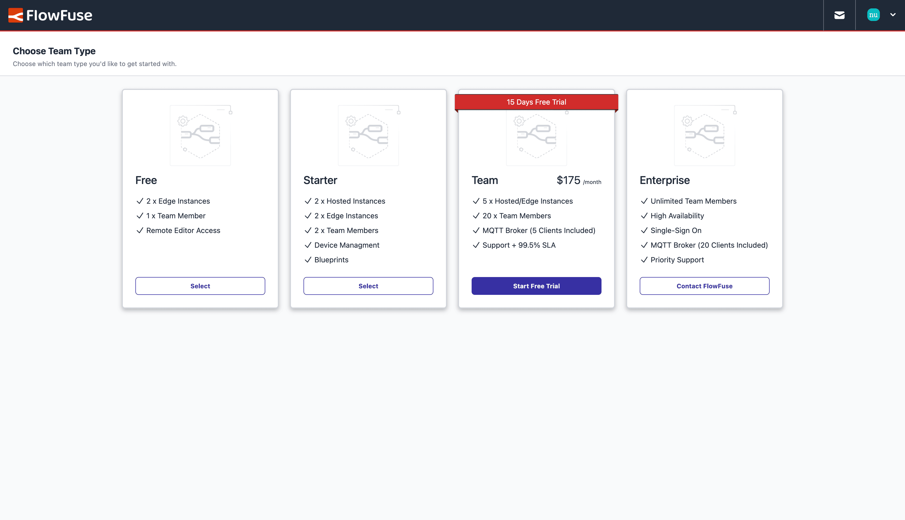 To create a free team, simply sign up to FlowFuse Cloud.